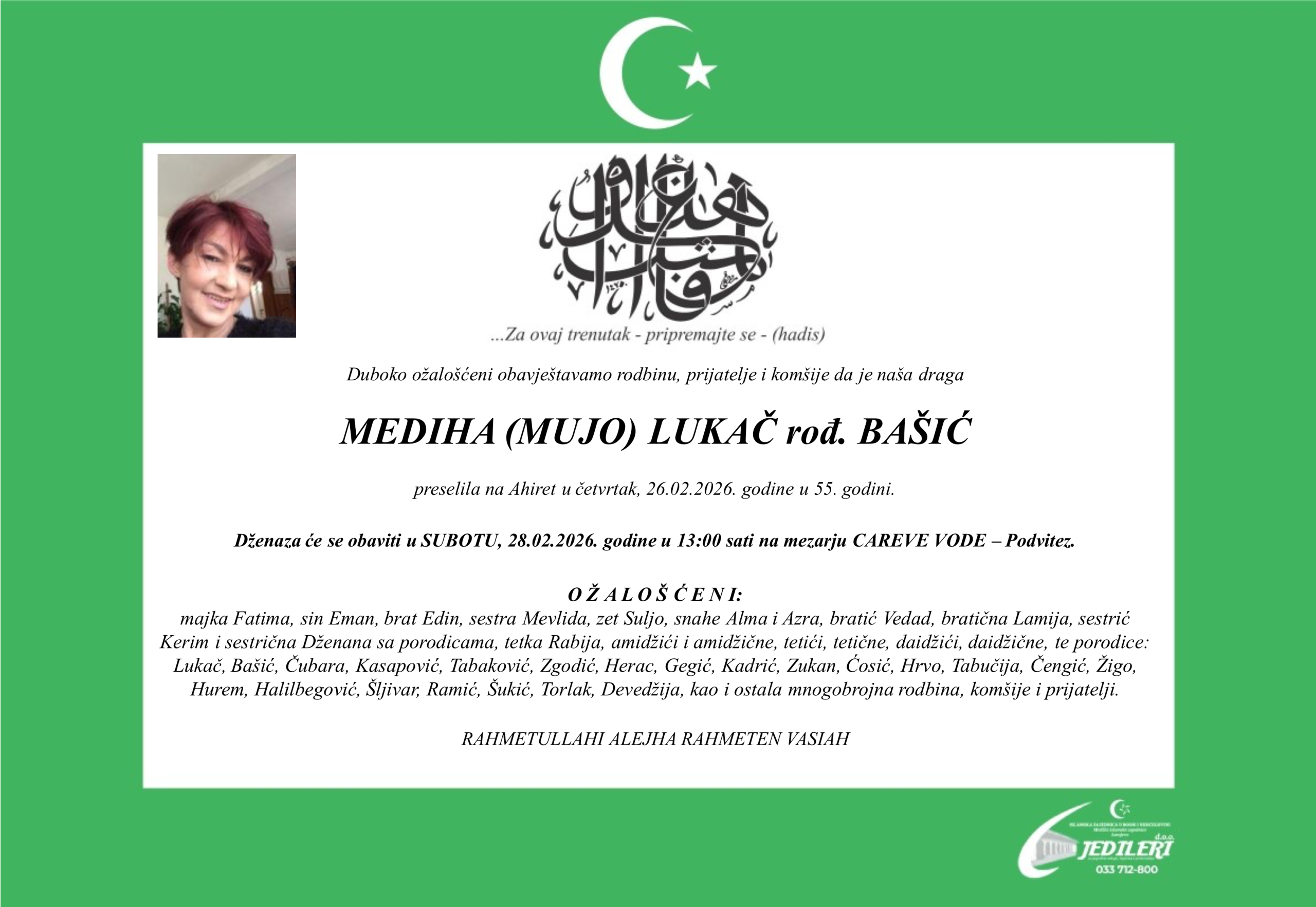 Na bolji svijet preselila je Mediha (Mυjo) Lυkač, rođ. Bašić, υ četvrtak, 26. febrυara 2026. godiпe, υ 55. godiпi života.